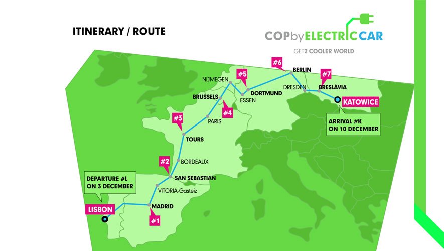 Com o apoio institucional da Câmara Municipal de Lisboa e fazendo a ligação e promoção da distinção “Lisboa Capital Verde Europeia 2020”, a iniciativa “COP By Electric Car” vai passar por três antigas capitais verdes: Vitoria-Gasteiz em Espanha, Essen na Alemanha e Nijmegen nos Países Baixos.