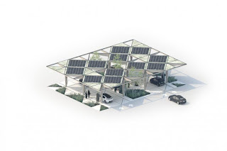 No topo das colunas, a superfície serve como base não só para os painéis solares como também para um pequeno jardim com canteiros, preenchendo uma área total de 400 metros quadrados. Esta copa de árvores artificial serve também como proteção para uma zona de repouso, onde os automobilistas podem descansar durante alguns minutos, ou fazer um piquenique rápido, enquanto o carregador transfere energia para o carro.