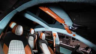 Optou-se por utilizar uma série de tecidos e couros ecológicos, o último dos quais agrega um toque saudável de cor laranja ao interior cinza escuro do veículo. As inserções dos bancos e dos descansos de cabeça estão adornadas com um padrão de tecido branco e azul turquesa que a Vilner denomina “um pequeno alívio decorativo”. Essa cor turquesa também está presente no console central.