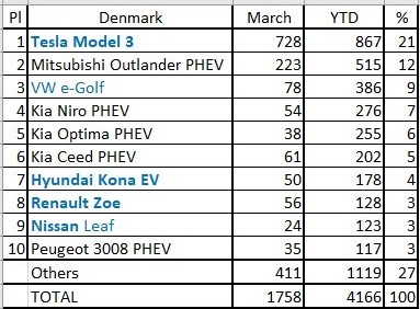 Segundo o blog EV Sales, a Dinamarca bateu o recorde próprio de comercialização de automóveis da categoria no mês de março de 2020.